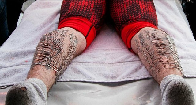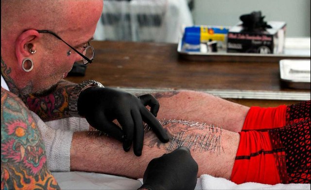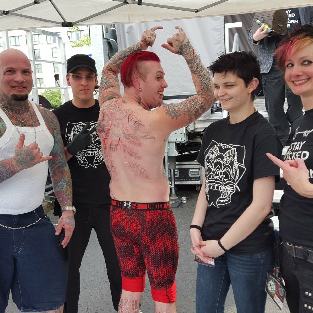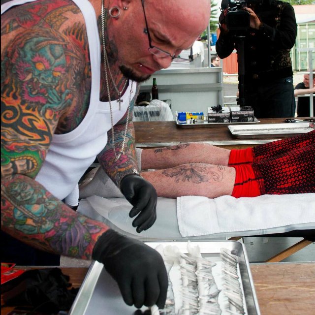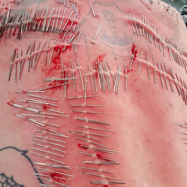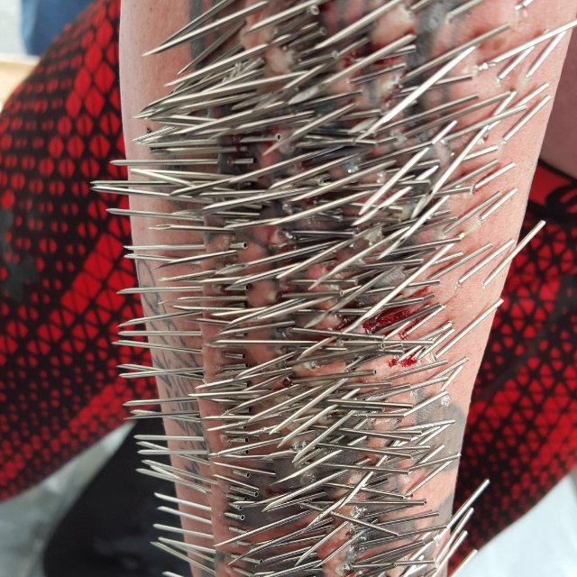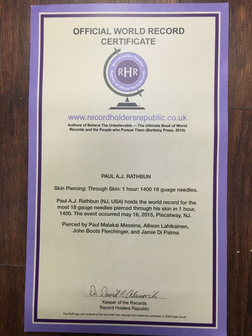 On May 16th 2015 In Piscataway, New Jersey, Paul AJ Rathbun set out to beat a world record set previously by himself back in Feb 2012 where the old record set at 946 needles pierced through skin in one hour. Paul, being a side show performer did a routine called the “HUMAN PIN CUSHION”. Which involves taking a needle and skewering it through a portion of his skin. He had been doing this routine for so long that one day he literally just thought… Hey I should set a piercing World Record. His old show partner asked him what he would do to set the World Record and Paul said strongly… Maybe I’ll do a pincushion never seen for the most “Surface Piercings” in one hour which consists of piercing the skin with a 18 gauge needle with an entrance of the needle and an exit. And then It just kind of went from there and Paul Rathbun made it a reality. To beat the previous WORLD RECORD of 946 piercings, Paul brought together a team of professionally trained Body Piercers from all over the state of New Jersey. That crew consisted of Yours truly… Paul Malakai Messina “MASTER PIERCER”, Allison Lahikainen, John “BOOTS” Flerchinger and Jamie Di Palma. All Piercers are professionally trained in the Arts of Body Modification and were all there to make the new WORLD RECORD of 1400 piercings through human skin in 1 hour. It takes skill and precision to execute piercings such as these and this is and was an extremely dangerous procedure so kids… DON’T TRY THIS AT HOME!!! All the needles were pre sterilized in an autoclave prior to the event. “MASTER PIERCER” Paul Malakai Messina personally threw 767 needles into the calfs and lower torso of Paul Rathbun and the rest of the needles were performed by the remaining 3 EXTREMELY talented Body Piercers. WE GOT 1399 NEEDLES into Paul’s body just one minute under the hour mark and the LAST 1400th needle was entered into Paul’s body by the man himself. This was and is a memory I will forever cherish. At first when I received the call where a voice on the other end of the phone was asking me if we had a Body Piercer that would like to help out and set a World Record for 1400 piercings in one hour, I said to myself… HELL NO!!!… Im not even gunna attempt to do this.. Then I asked who is the lunatic attempting to do such an insane number of piercings in one hour and was told.. A guy named WYCK aka Paul AJ Rathbun. So… I knew this guy from being tattooed by Alex Pea at our former studio Inksanity Tattoo in Somerset, NJ and I knew I could help the amazing Piercing team he already had so I said “YES” and the rest is WORLD RECORD HISTORY…
